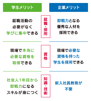 そのため、個人で就職活動をする必要はなく、2年間しっかり学びに集中し、卒業と同時に本学と提携関係を結ぶ産学共同企業にスムーズに就職することができます。学生にとっては、実際の現場を知ったうえで就職できるため、就職でのミスマッチを未然に防ぐことができ、入社初日から同期入社の社員に差をつけて即戦力となって活躍できるメリットがあります。
